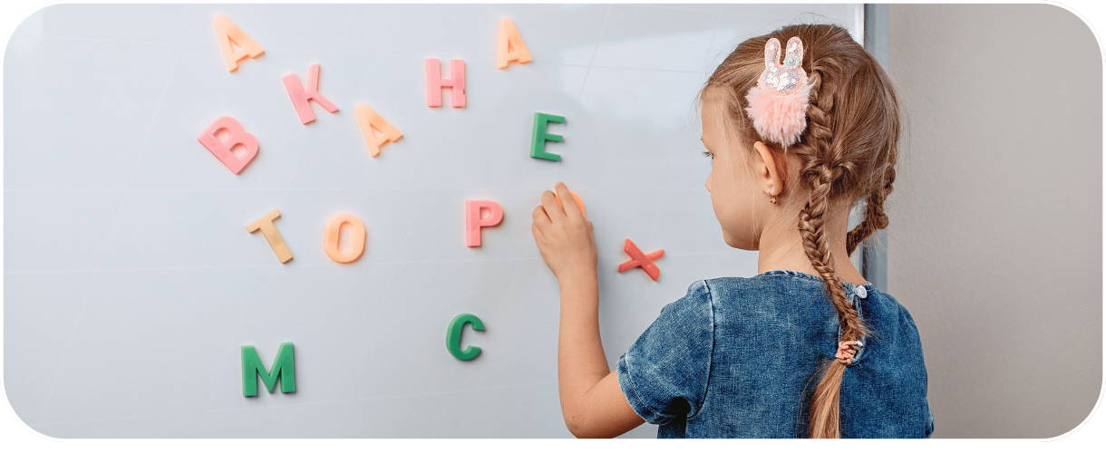 - Les tableaux blancs magnétiques effaçables à sec sont un excellent endroit pour écrire les premières lettres avec des marqueurs dédiés. Vous pouvez également y fixer des aimants en forme de lettres de l’alphabet, qui peuvent constituer un soutien supplémentaire dans l’apprentissage.