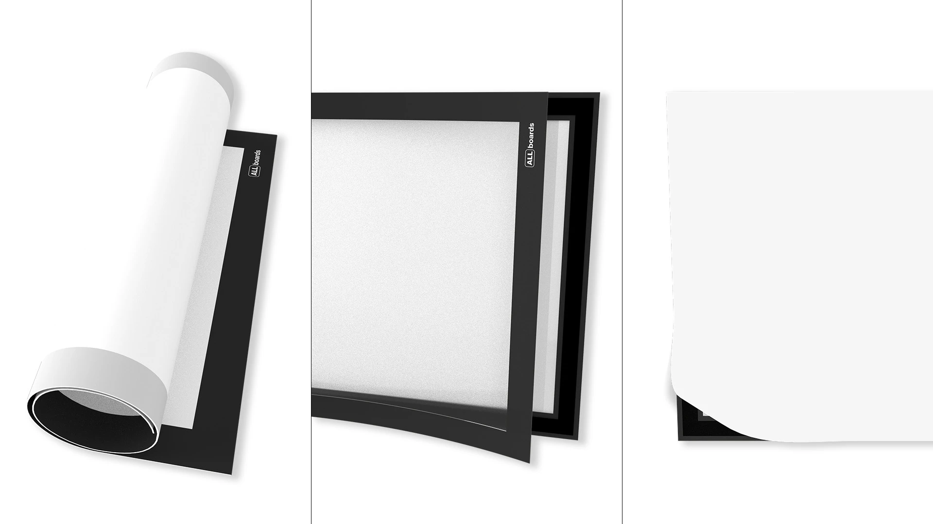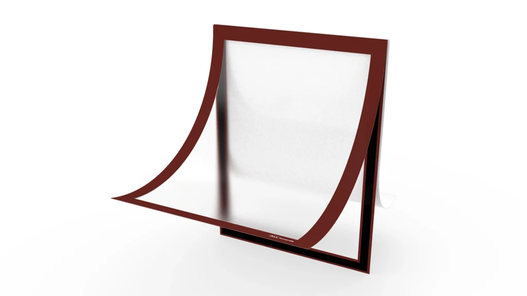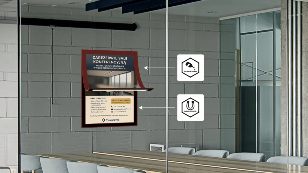 Grâce à sa conception, le changement de feuilles, d'imprimés ou d'autres supports insérés dans le cadre est rapide et pratique : il suffit de replier les côtés du cadre, sans avoir à le décoller de la surface.
