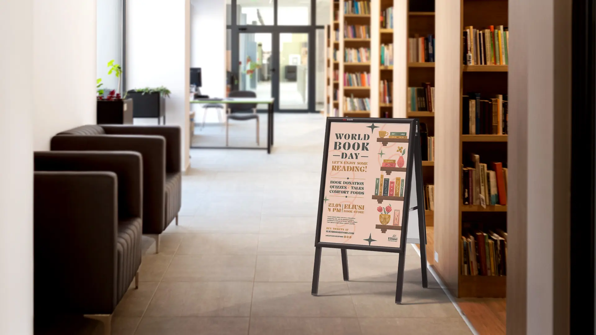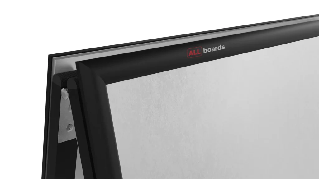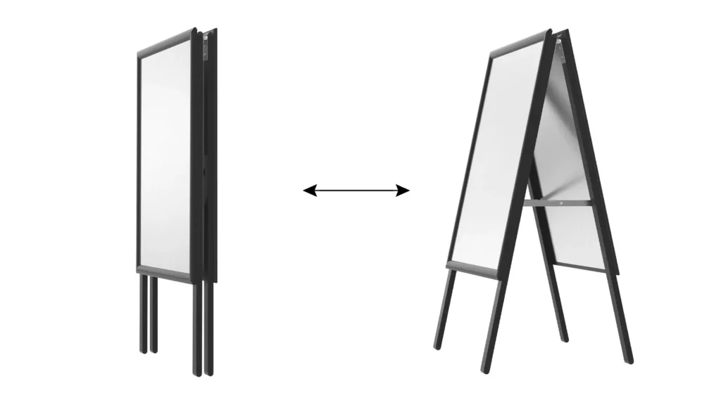 - Léger et résistant - le porte-affiche peut être facilement déplacé d'une pièce à l'autre grâce à sa légèreté. Des charnières solides avec un mécanisme de verrouillage contre le pliage maintiennent la publicité attachée en un seul endroit, quelles que soient les conditions.