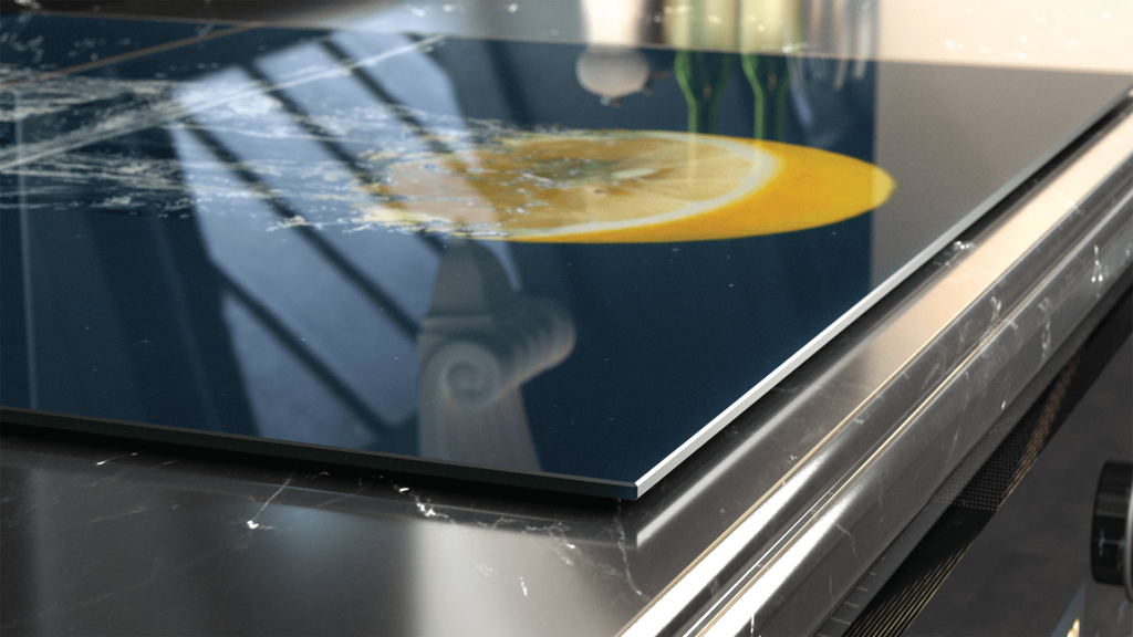 Du verre trempé de 4 mm d'épaisseur a été utilisé pour la production. Les bords du verre sont meulés et les coins arrondis. Cela garantit la sécurité dans l'utilisation quotidienne. Grâce à sa surface en verre, la plaque est très facile à nettoyer au quotidien.