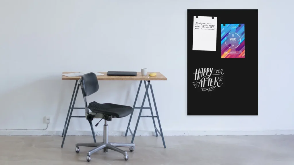 - SURFACE À CRAIE – la base du tableau est un panneau composite de haute rigidité avec un revêtement de tableau à craie noir. Cela lui confère une apparence élégante et une couleur noire profonde. Vous pouvez écrire sur la surface avec des craies et des marqueurs à craie.
