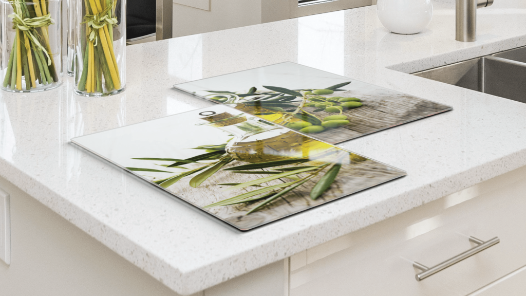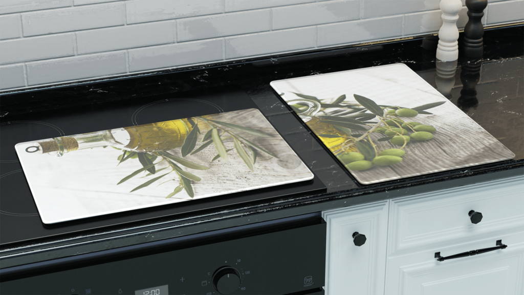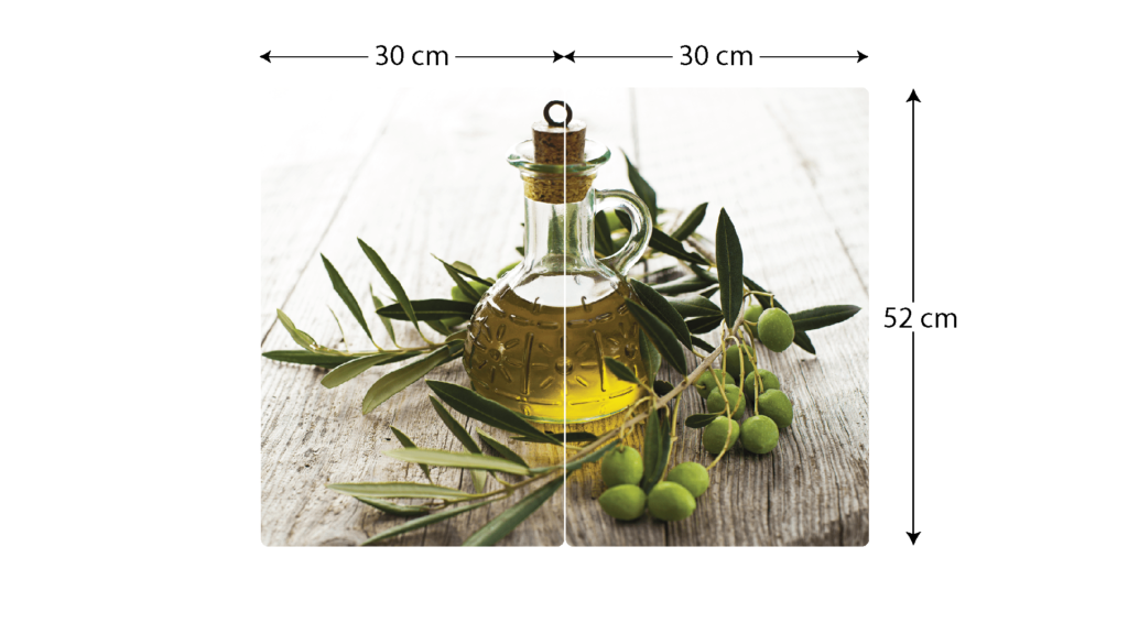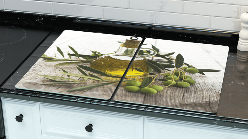 Plaque de Protection en Verre Trempé Universel et Multifonction – Planche à Découper & Plateau en Verre, 2 pièces 52x30cm Motif Huile d’Olive