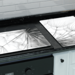La plaque de protection est disponible en différents motifs et complète le design innovant d'une cuisine en tant qu'élément supplémentaire esthétique.