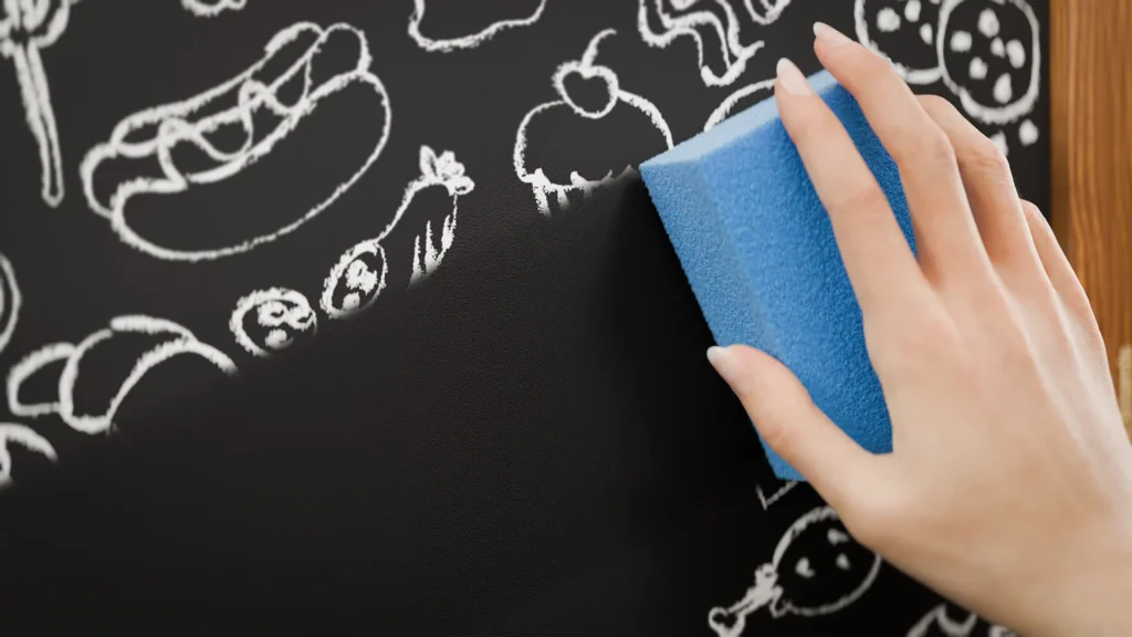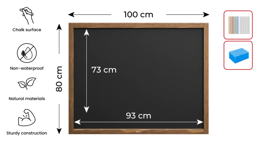 La surface du tableau est constituée d'un panneau en fibres de bois HDF laqué noir qui est caractérisé par sa haute densité. Le processus minutieux de revêtement de la surface avec un vernis spécial garantit un bon contraste et fait en sorte que la poussière des craies ou des marqueurs à craie liquide ne pénètre pas dans la surface et s'enlève facilement avec un chiffon humide. Le tableau est résistant aux rayures et facile à utiliser.