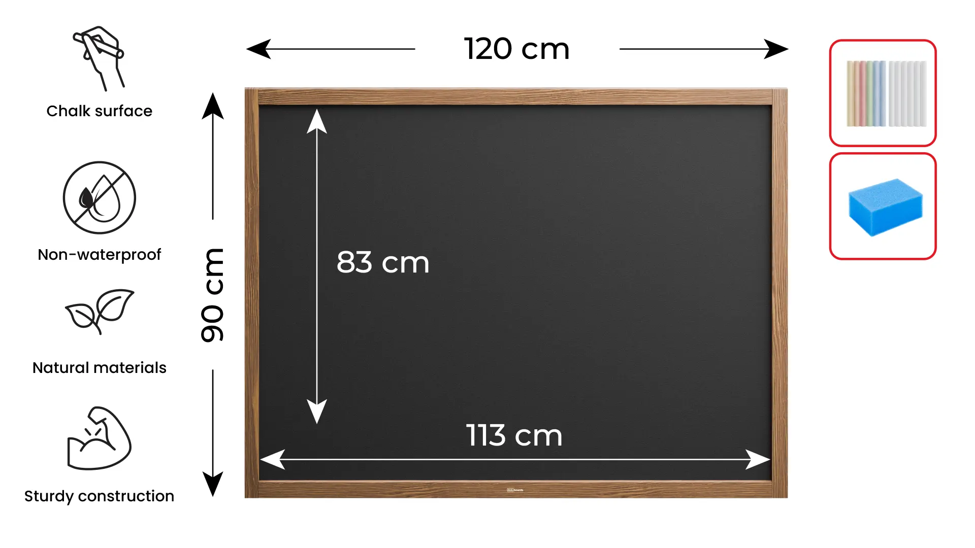La surface du tableau noir craie 90x120 est constituée d’une plaque en fibres de bois HDF de couleur noire de très haute densité ce qui est gage de qualité pour ce type de produit. La technologie minutieuse de revêtement de la surface du tableau noir craie 90x120 est assurée par un vernis spécial qui garantit un bon contraste afin d’empêcher la poussière des craies ou des marqueurs à craie liquide de pénétrer dans la surface et de s’enlever en toute facilité avec un chiffon humide. Le tableau noir craie 90x120 est résistant aux rayures et facile d’utilisation.