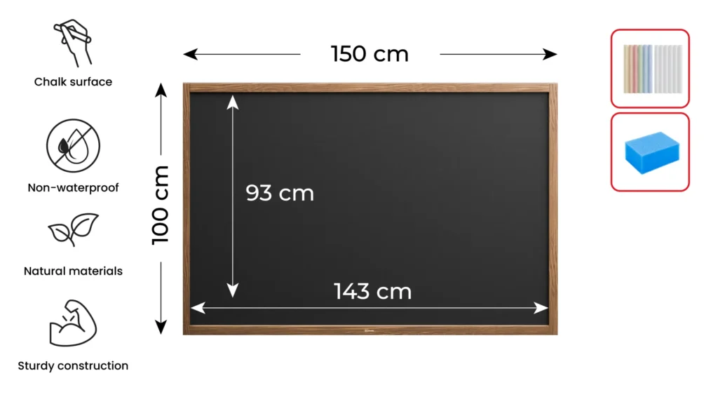 La surface du tableau est constituée d'un panneau en fibres de bois HDF laqué noir qui est caractérisé par sa haute densité. Le processus minutieux de revêtement de la surface avec un vernis spécial garantit un bon contraste et fait en sorte que la poussière des craies ou des marqueurs à craie liquide ne pénètre pas dans la surface et s'enlève facilement avec un chiffon humide. Le tableau est résistant aux rayures et facile à utiliser.