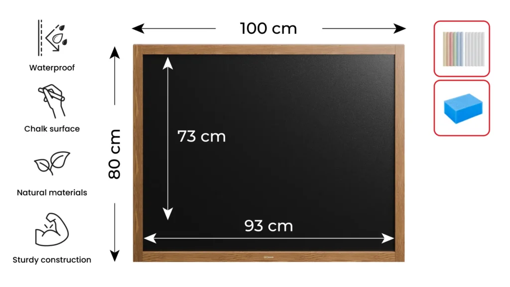 La surface du tableau est constituée d'un panneau en fibres de bois ABS laqué noir qui est caractérisé par sa haute densité. Le processus minutieux de revêtement de la surface avec un vernis spécial garantit un bon contraste et fait en sorte que la poussière des craies ou des marqueurs à craie liquide ne pénètre pas dans la surface et s'enlève facilement avec un chiffon humide. Le tableau est résistant aux rayures et facile à utiliser.