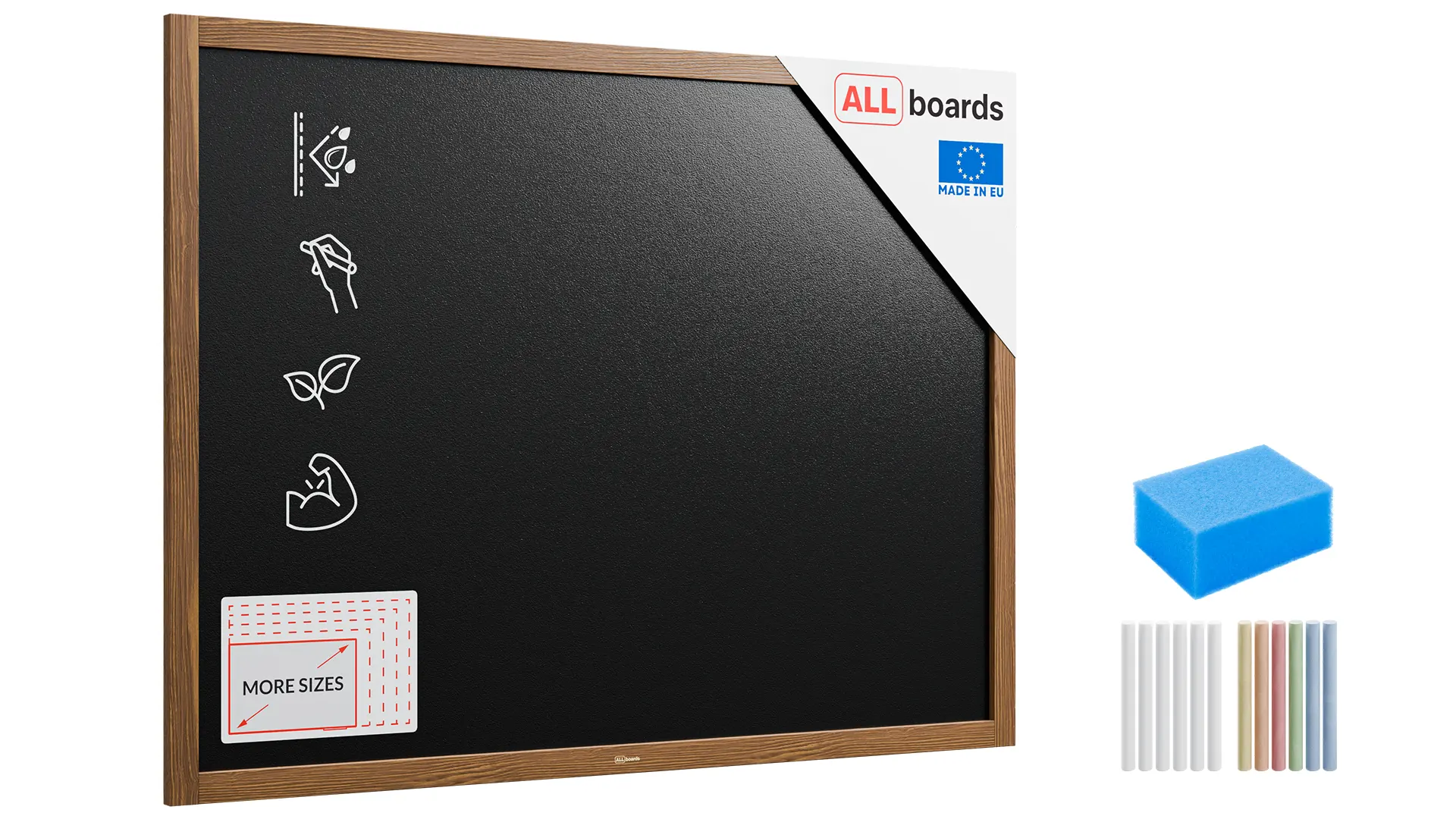 La surface du tableau est constituée d'un panneau en fibres de bois ABS laqué noir qui est caractérisé par sa haute densité. Le processus minutieux de revêtement de la surface avec un vernis spécial garantit un bon contraste et fait en sorte que la poussière des craies ou des marqueurs à craie liquide ne pénètre pas dans la surface et s'enlève facilement avec un chiffon humide. Le tableau est résistant aux rayures et facile à utiliser.