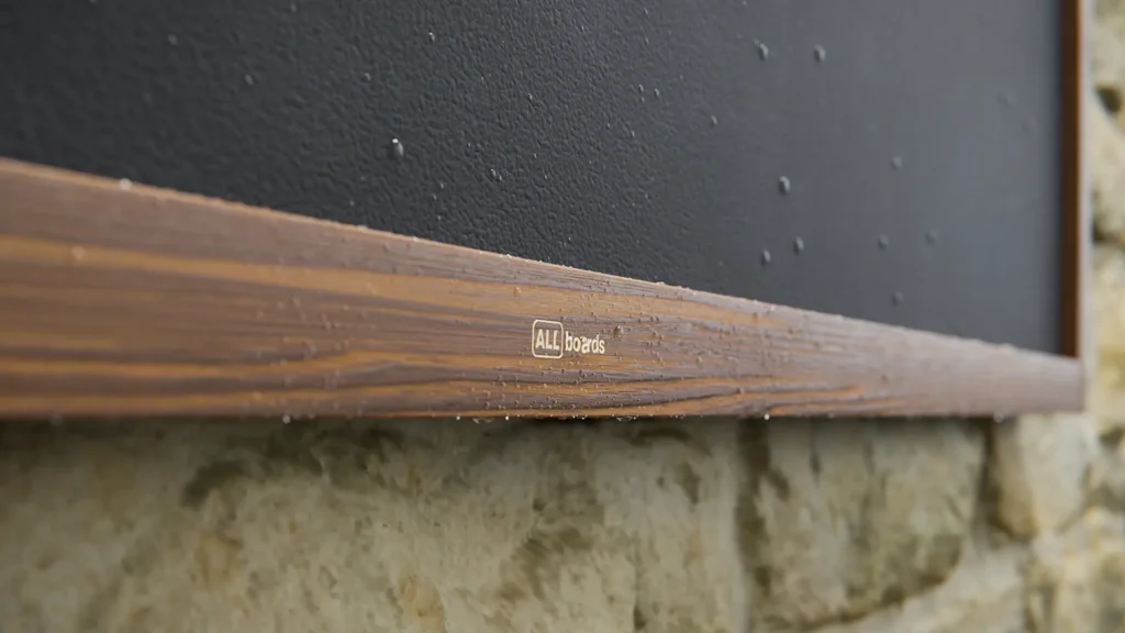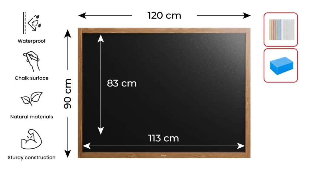 La surface du tableau est constituée d'un panneau en fibres de bois ABS laqué noir qui est caractérisé par sa haute densité. Le processus minutieux de revêtement de la surface avec un vernis spécial garantit un bon contraste et fait en sorte que la poussière des craies ou des marqueurs à craie liquide ne pénètre pas dans la surface et s'enlève facilement avec un chiffon humide. Le tableau est résistant aux rayures et facile à utiliser.