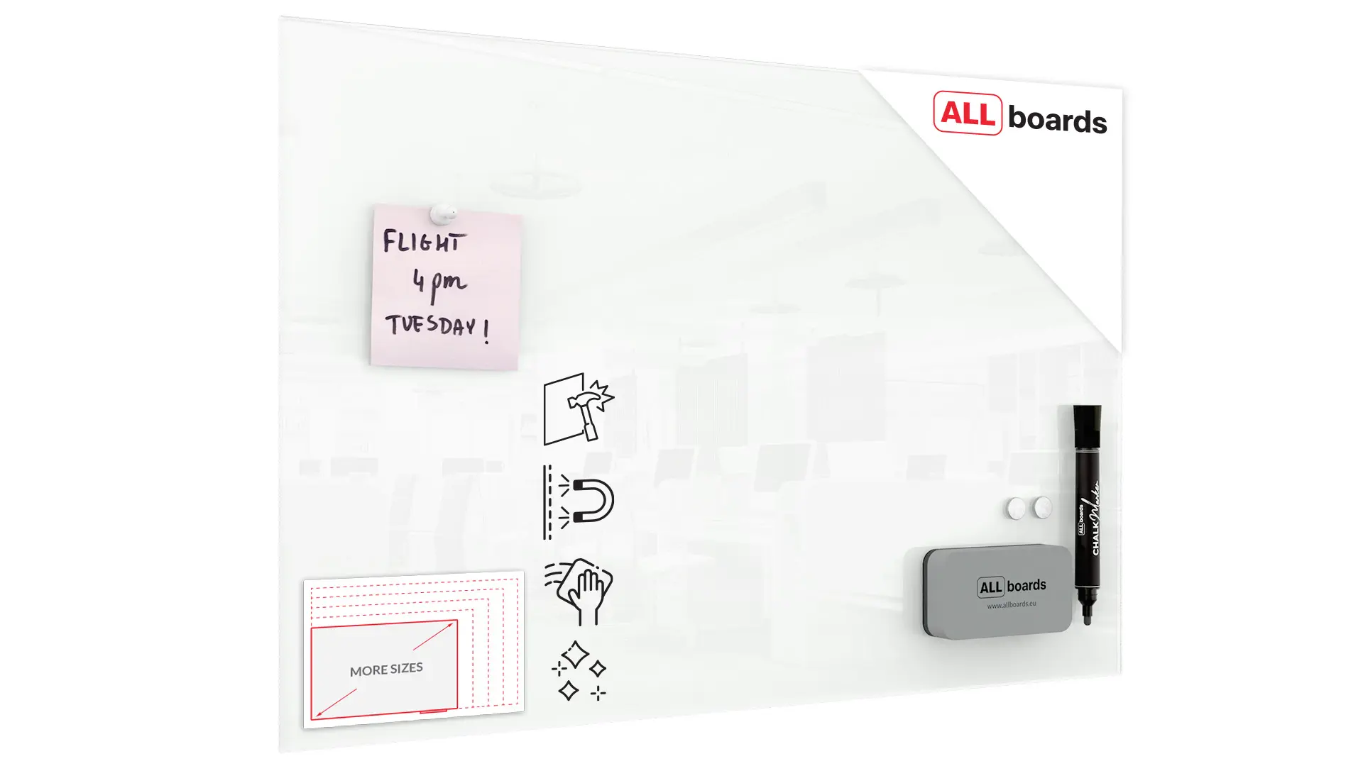 ATTENTION ! Veuillez noter que seuls des aimants en néodyme de puissance magnétique appropriée doivent être utilisés pour les tableaux magnétiques en verre. Les aimants basiques (noirs) et les petits aimants au néodyme (de faible puissance) ne tiendront pas sur un tableau magnétique en verre. Les aimants décoratifs et touristiques (souvenirs) risquent également de ne pas tenir sur le tableau magnétique en verre. Il convient également d'être prudent lors de l'utilisation d'aimants en néodyme.