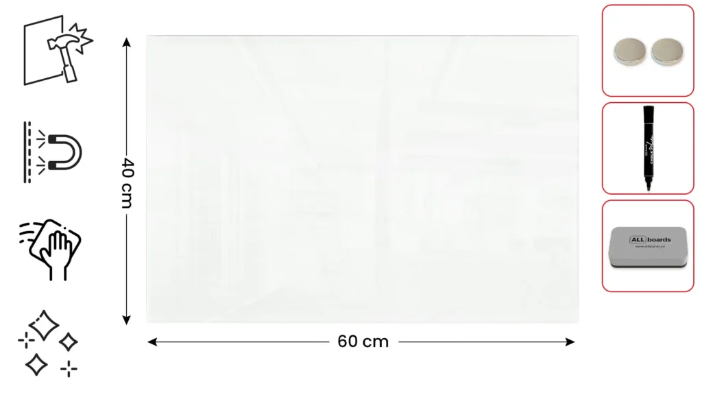Tableau Blanc en Verre CLASSIC WHITE 60x40cm, Tableau Magnétique sans Cadre, Verre Trempé + ACCESSOIRES