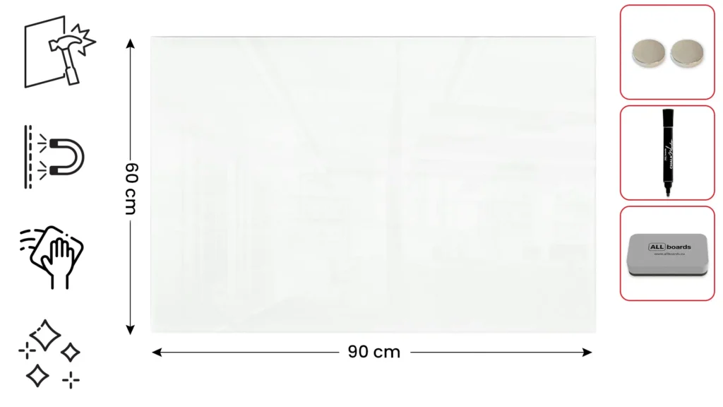 Tableau Blanc en Verre CLASSIC WHITE 90x60cm, Tableau Magnétique sans Cadre, Verre Trempé + ACCESSOIRES