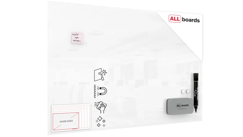 Le tableau en verre magnétique et effaçable à sec peut être utilisé de différentes manières - écrivez dessus avec n'importe quel type de marqueur ou fixez des notes importantes avec des aimants en néodyme. Grâce à lui, vous gagnez en productivité en organisant les informations clés. C'est également un endroit idéal pour les dessins créatifs et les notes détaillées, que vous pouvez facilement effacer à l'aide d'une éponge ou d'un chiffon dès que vous n'en avez plus besoin. Ainsi le tableau est très facile à entretenir.