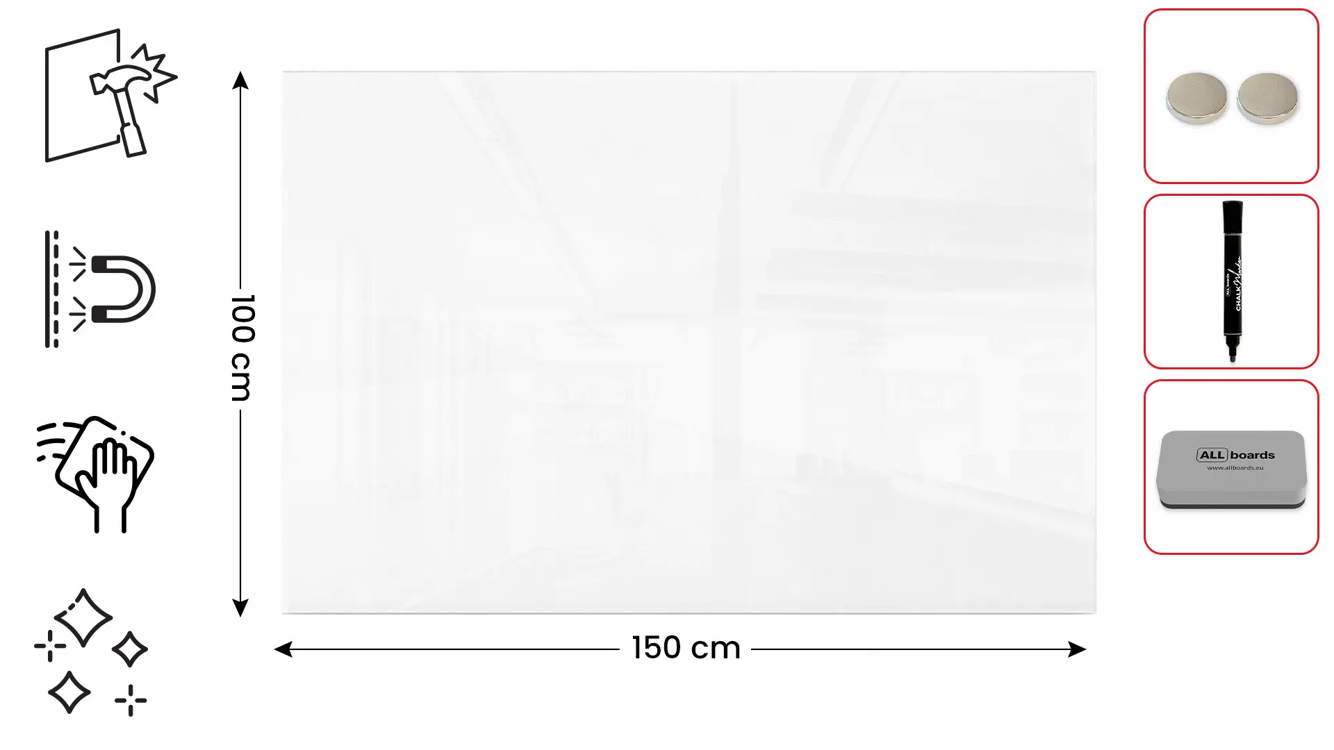 Tableau Blanc en Verre PREMIUM SUPERWHITE 150x100cm, Tableau Magnétique sans Cadre, Verre Trempé + ACCESSOIRES