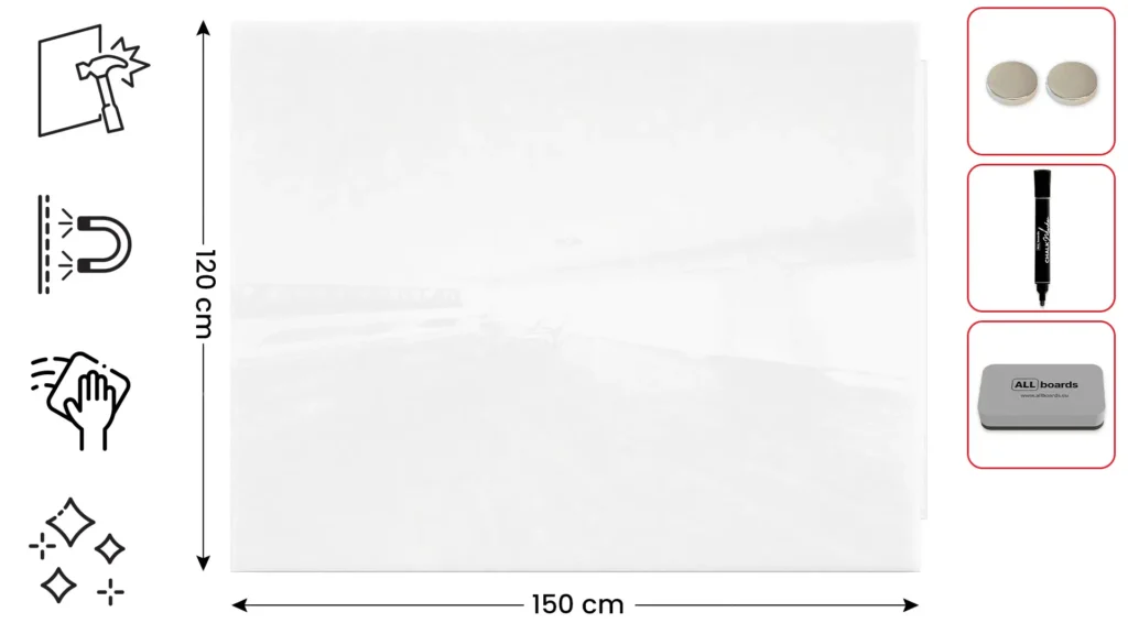 Tableau Blanc en Verre PREMIUM SUPERWHITE 150x120cm, Tableau Magnétique sans Cadre, Verre Trempé + ACCESSOIRES