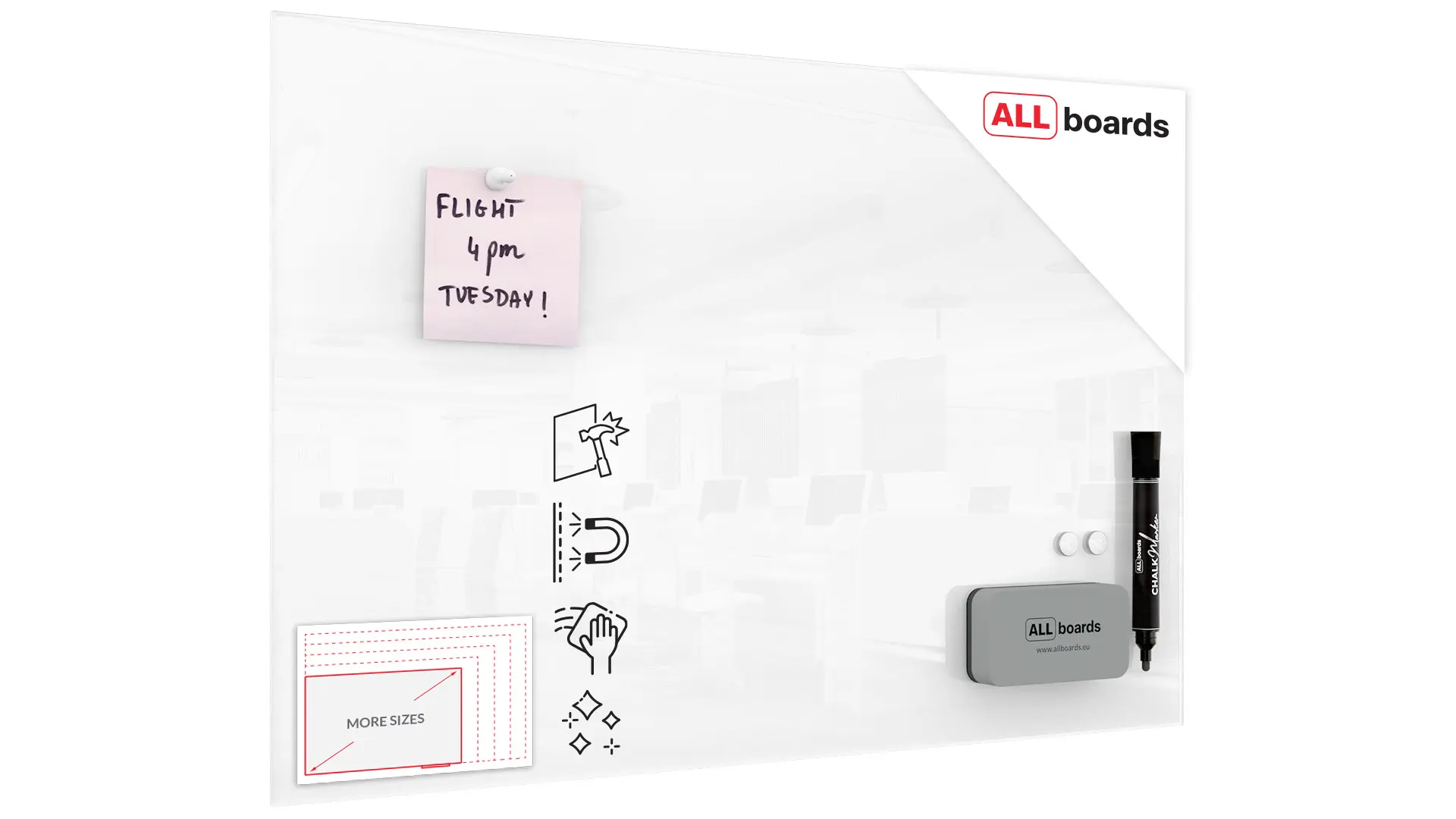 ATTENTION ! Veuillez noter que seuls des aimants en néodyme de puissance magnétique appropriée doivent être utilisés pour les tableaux magnétiques en verre. Les aimants basiques (noirs) et les petits aimants au néodyme (de faible puissance) ne tiendront pas sur un tableau magnétique en verre. Les aimants décoratifs et touristiques (souvenirs) risquent également de ne pas tenir sur le tableau magnétique en verre. Il convient également d'être prudent lors de l'utilisation d'aimants en néodyme.