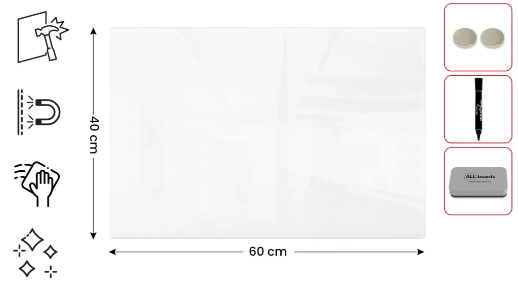 Tableau Blanc en Verre PREMIUM SUPERWHITE 60x40cm, Tableau Magnétique sans Cadre, Verre Trempé + ACCESSOIRES