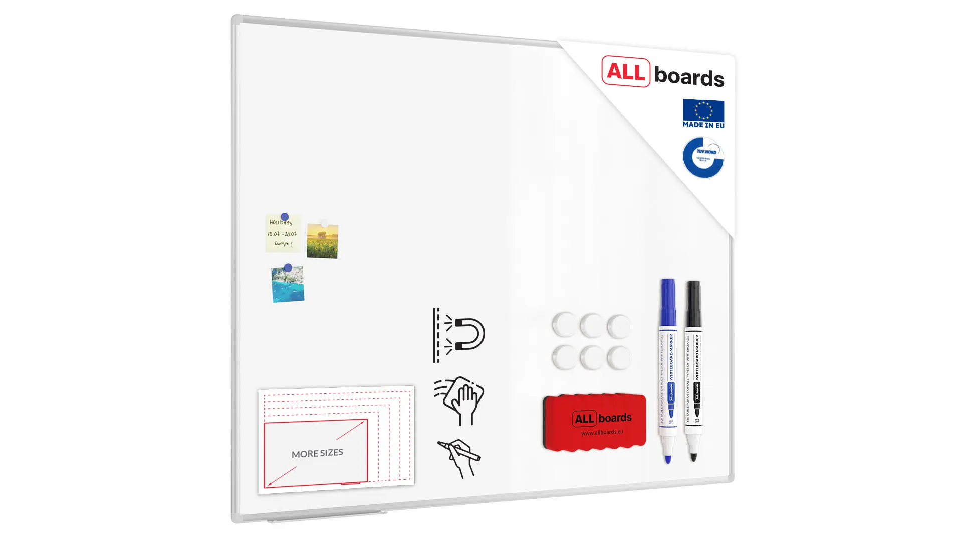Le tableau blanc est idéal pour une utilisation au bureau et à la maison. Utilisez-le comme un organisateur ou un planificateur. Accrochez-y des documents d'entreprise, des listes de courses ou des photos. Les possibilités sont infinies !