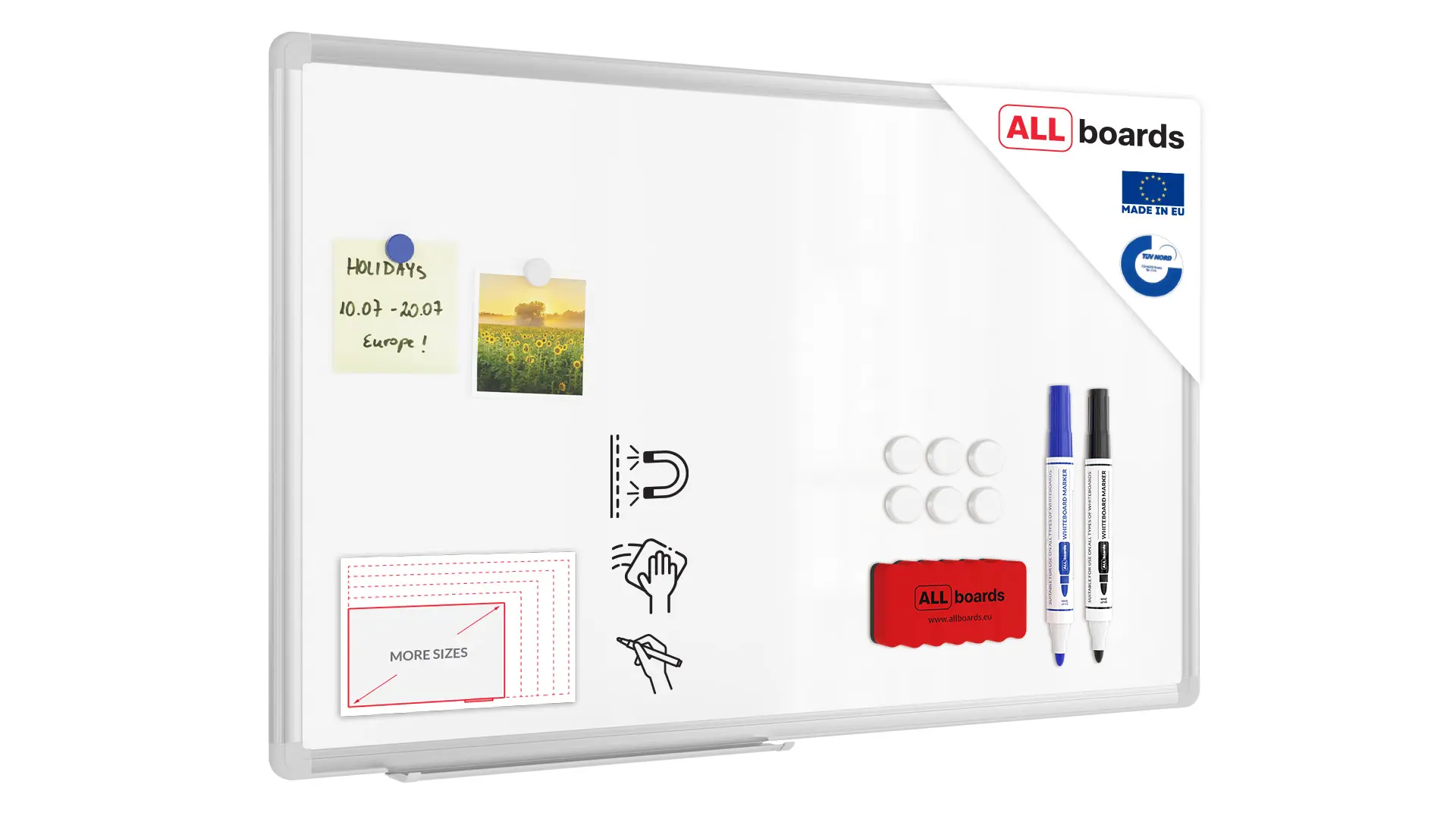 Le tableau blanc est idéal pour une utilisation au bureau et à la maison. Utilisez-le comme un organisateur ou un planificateur. Accrochez-y des documents d'entreprise, des listes de courses ou des photos. Les possibilités sont infinies !