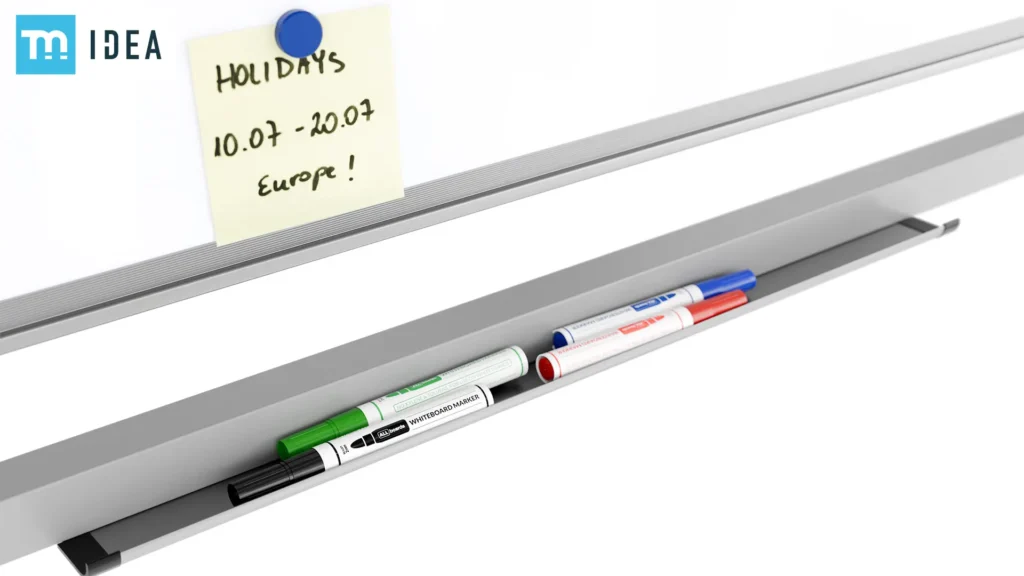 La surface recto-verso offre encore plus d'espace pour toutes vos notes importantes. Pour revenir rapidement au texte de l'autre côté, il suffit de faire pivoter le tableau. Placé sur un support à roulettes, il est également facile à réorganiser. Une étagère à marqueurs en aluminium est incluse afin que vous puissiez organiser tous vos accessoires de manière à ce qu'ils soient facilement accessibles.