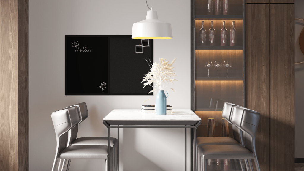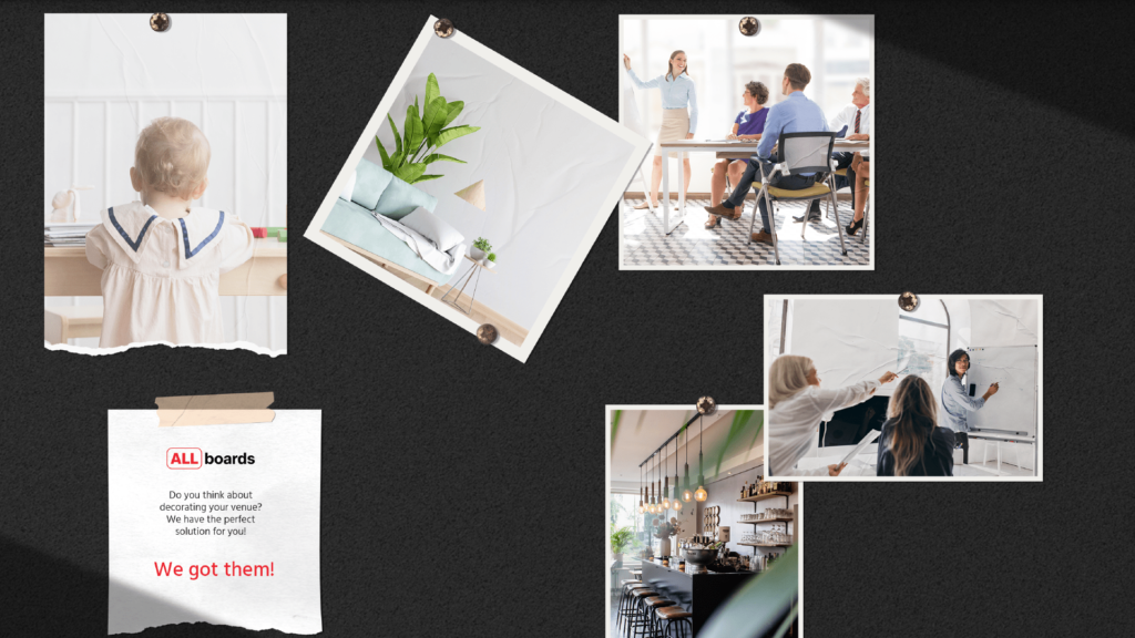 Le tableau combiné ALLboards, outre la fonctionnalité du tableau à craie magnétique et du tableau en liège, présente un aspect moderne et élégant. La palette de couleurs s'accorde parfaitement avec la décoration intérieure. Le tableau s'intègre parfaitement dans une chambre d'enfants, mais aussi dans d'autres pièces de la maison. Il aura également une fonction utile dans une entreprise, un local, un restaurant ou un hôtel.