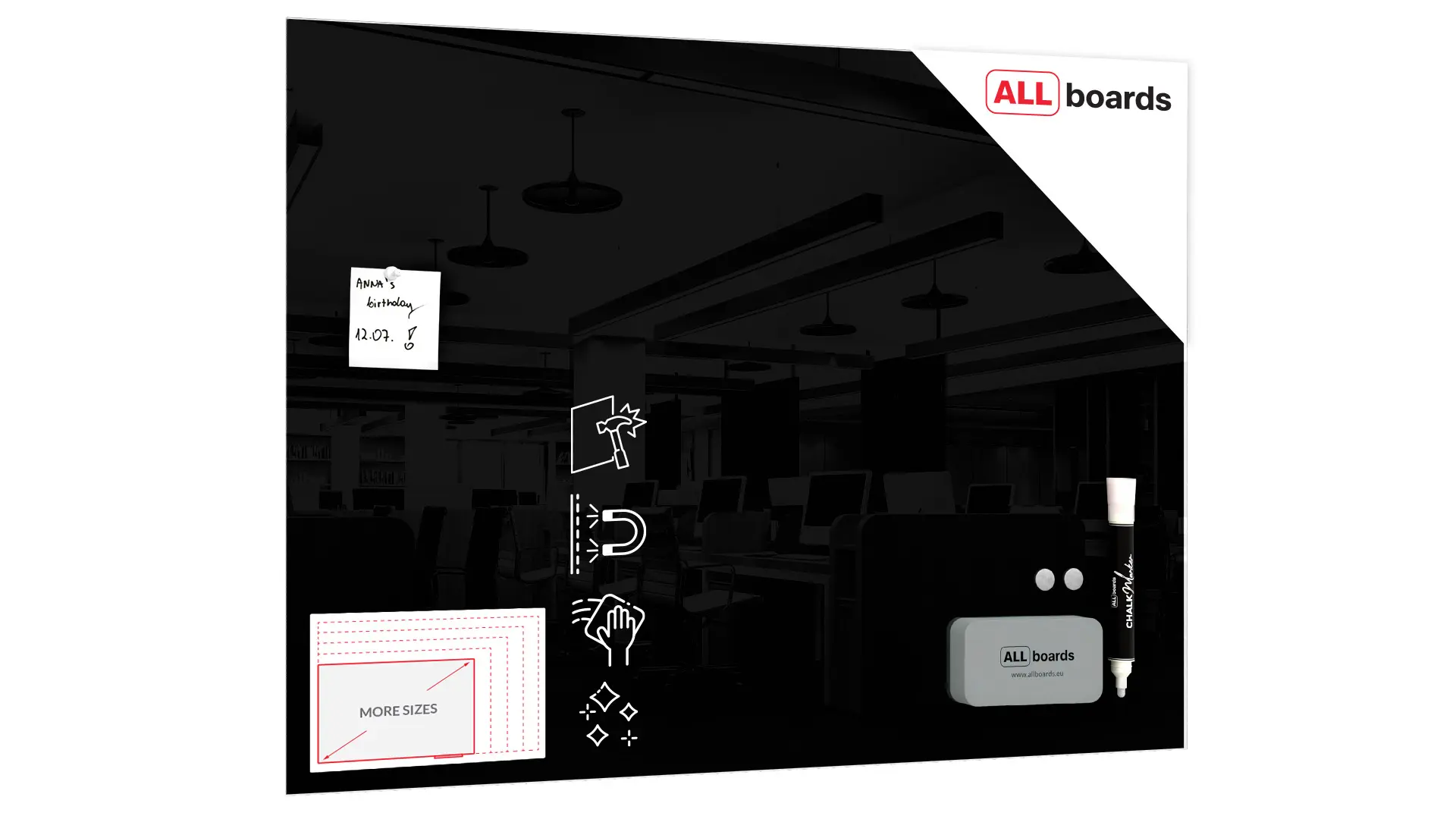 ATTENTION ! Veuillez noter que seuls des aimants en néodyme de puissance magnétique appropriée doivent être utilisés pour les tableaux magnétiques en verre. Les aimants basiques (noirs) et les petits aimants au néodyme (de faible puissance) ne tiendront pas sur un tableau magnétique en verre. Les aimants décoratifs et touristiques (souvenirs) risquent également de ne pas tenir sur le tableau magnétique en verre. Il convient également d'être prudent lors de l'utilisation d'aimants en néodyme.