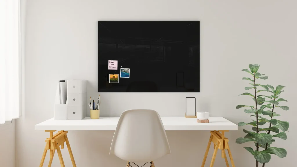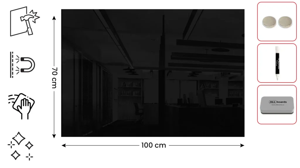 Le tableau en verre magnétique et effaçable à sec peut être utilisé de différentes manières - écrivez dessus avec n'importe quel type de marqueur ou fixez des notes importantes avec des aimants en néodyme. Grâce à lui, vous gagnez en productivité en organisant les informations clés. C'est également un endroit idéal pour les dessins créatifs et les notes détaillées, que vous pouvez facilement effacer à l'aide d'une éponge ou d'un chiffon dès que vous n'en avez plus besoin. Ainsi le tableau est très facile à entretenir.
