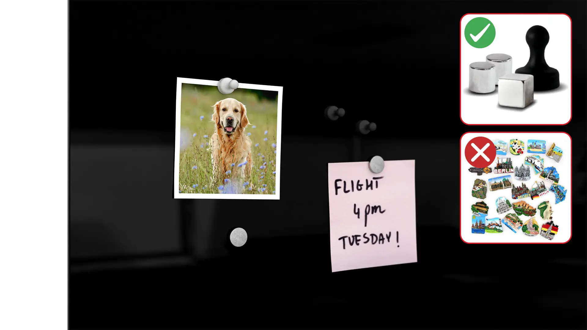 ATTENTION ! Veuillez noter que seuls des aimants en néodyme de puissance magnétique appropriée doivent être utilisés pour les tableaux magnétiques en verre. Les aimants basiques (noirs) et les petits aimants au néodyme (de faible puissance) ne tiendront pas sur un tableau magnétique en verre. Les aimants décoratifs et touristiques (souvenirs) risquent également de ne pas tenir sur le tableau magnétique en verre. Il convient également d'être prudent lors de l'utilisation d'aimants en néodyme.